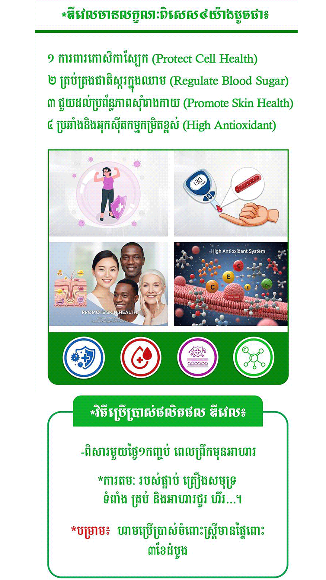 ✔️ជួយសម្រកទំងន់ និងរក្សាតុល្យភាពរាងកាយ ✔️ជួយការពារជំងឺខ្វះឈាម ដែលសំបូរទៅដោយសារធាតុប្រឆាំងអុកស៊ីតកម្ម ✔️ជួយការពារជំងឺមហារីក ,ការពារជំងឺកកឈាមបេះដូង ✔️ជួយការពារការរលាកបាតភ្នែក និងធ្វើអោយភ្នែកមានសុខភាពល្អ ✔️ជួយកាត់បន្ថយកំរឹតកូលេស្តេរ៉ុលក្នុងខ្លួន ✔️ការពារកោសិកាពីការបំផ្លាញដោយរ៉ាឌីកាល់សេរី មានសារជាតិ ប៉ូលីហ្វេណុលជួយគ្រប់គ្រងកំរឹតជាតិស្ករក្នុងឈាម ✔️ជួយពង្រឹងដល់ប្រព័ន្ធរំលាយអារហារ ✔️ជួយរំលាយខ្លាញ់មិនល្អយ៉ាងមានប្រសិទ្ធិភាព ✔️ជួយកាត់បន្ថយហានីភ័យនៃជំងឺ Alzheimer & Parkinson
